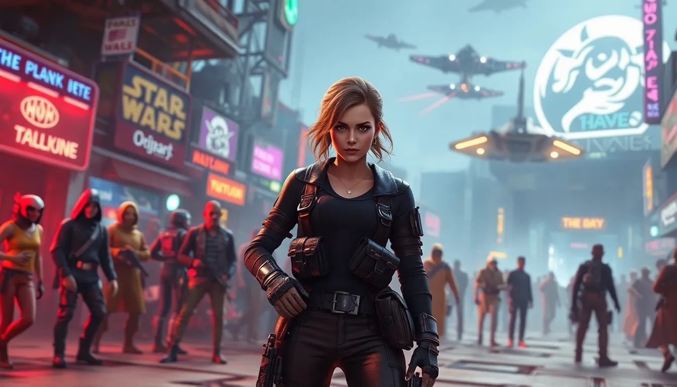 female smuggler in a futuristic Star Wars urban setting.